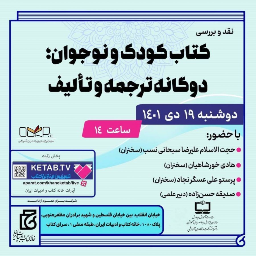 نشست نقد و بررسی «کتاب کودک و نوجوان؛ دوگانه ترجمه و تألیف» به همت سازمان پژوهش و برنامهریزی آموزشی، 19 دی برگزار می شود.